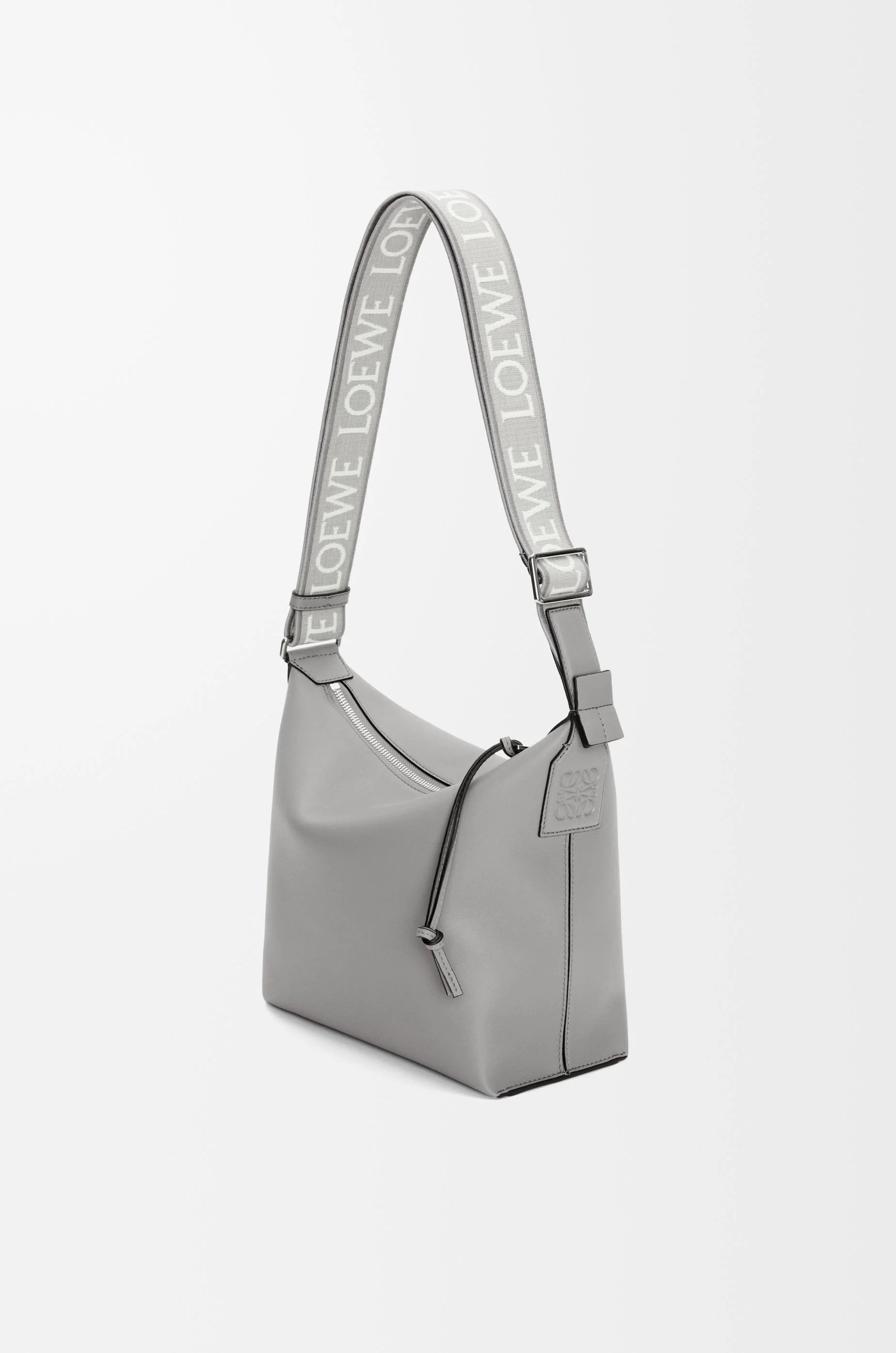 The Cubi Crossbody is a capacious and soft bag that adapts easily to the body. This small version is crafted in supple smooth calfskin with a LOEWE jacquard strap. - Crossbody or shoulder carry - Adjustable shoulder strap - Zip closure with calfskin zip pull - Internal slip pocket - Herringbone cotton canvas lining - Embossed Anagram Details - Colour: Asphalt Grey - Metallic colour: Palladium - Main material: Supple Smooth Calf/Jacquard - Strap length: 68 - 125 cm - Weight: 0.4 kg - Height (cm): 22 - Width (cm): 29.5 - Depth (cm): 10.5 - Height (inch): 8.7 - Width (inch): 11.6 - Depth (inch): 4.1 - Model ID: B906Q63X04 - CIL: 0011035292 - Made in: Portugal