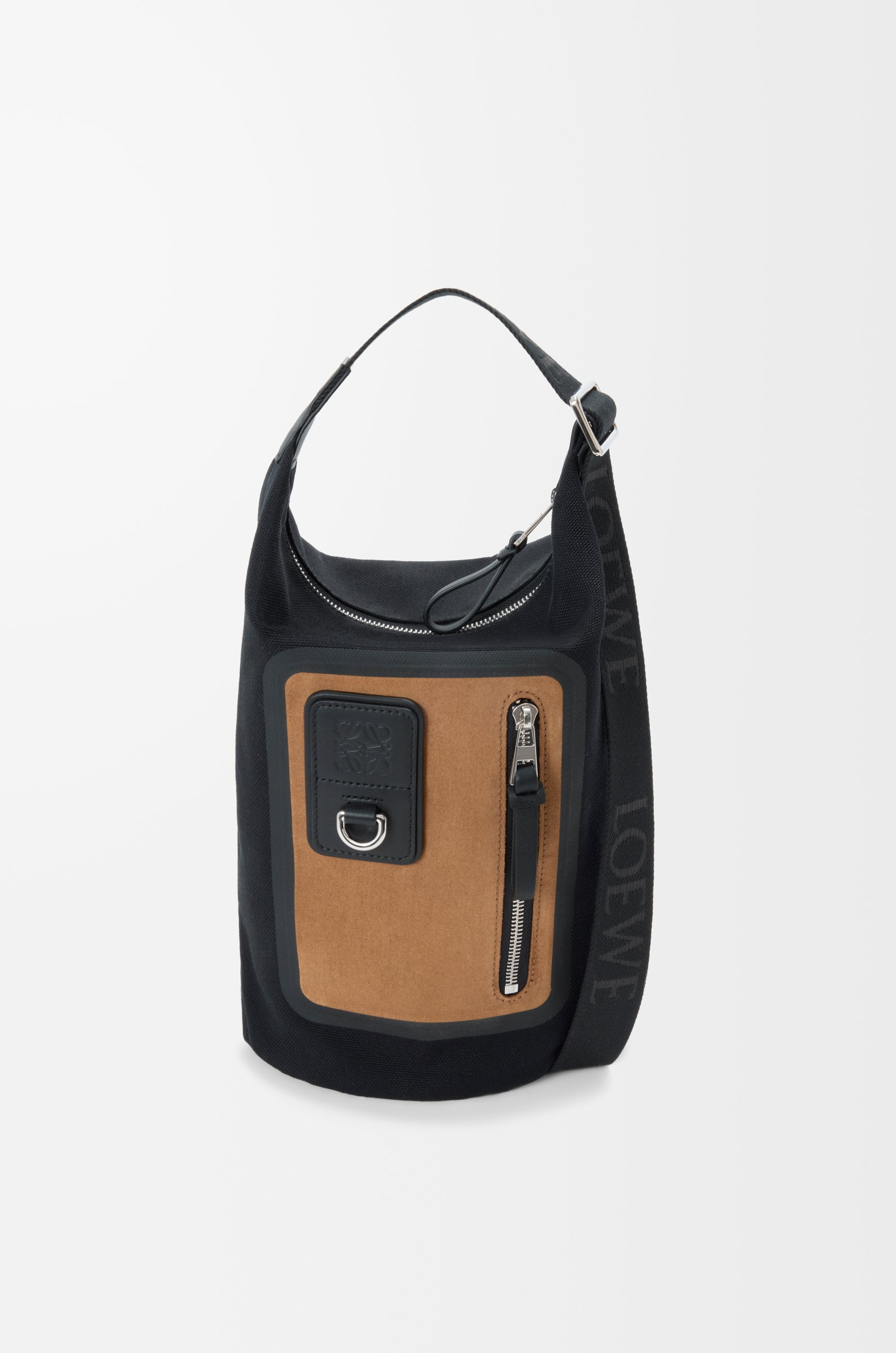 The Flex Loop bucket is a compact bag with a multi-functional silhouette designed to be carried in alternative ways as a sling or barrel. This small version is crafted in cotton canvas and suede. - Crossbody, shoulder or hand carry - Adjustable LOEWE webbing strap - Top and side zip closure - One zipped front pocket - Water-resistant nylon lining - Embossed Anagram with D-ring Colour: Black/Dark Gold Metallic colour: Palladium Main material: Canvas/Suede Strap length: 104 cm Strap drop: 53 cm Weight: 0.4325 kg Height: 34 cm Width: 27 cm Depth: 11.5 cm Made in: Portugal