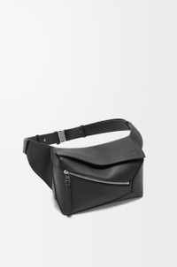 The Puzzle bag is the debut bag for LOEWE by Creative Director Jonathan Anderson. A cuboid shape and precise cutting technique create Puzzle’s distinctive geometric lines. This small bumbag version is crafted in classic calfskin with overlapped edges. - Shoulder or crossbody carry - Adjustable shoulder strap featuring metal clasp closure with engraved LOEWE - Zip closure with calfskin zip pull - External zip pocket and internal slip pocket - Herringbone cotton canvas lining - Embossed Anagram Details - Colour: Black - Metallic colour: Palladium - Main material: Classic Calf - Strap length: 88 - 147 cm - Weight: 0.54 kg - Height (cm): 16 - Width (cm): 24 - Depth (cm): 10.5 - Height (inch): 6.3 - Width (inch): 9.4 - Depth (inch): 4.1 - Model ID: B510SEBX02 - CIL: 0010965754 - Made in: Spain