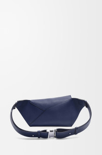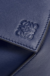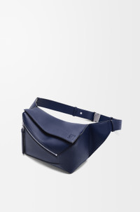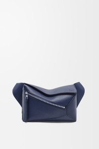 The Puzzle bag is the debut bag for LOEWE by Creative Director Jonathan Anderson. A cuboid shape and precise cutting technique create Puzzle’s distinctive geometric lines. This small bumbag version is crafted in classic calfskin with overlapped edges. - Shoulder or crossbody carry - Adjustable shoulder strap featuring metal clasp closure with engraved LOEWE - Zip closure with calfskin zip pull - External zip pocket and internal slip pocket - Herringbone cotton canvas lining - Embossed Anagram Details - Colour: Abyss Blue - Metallic colour: Palladium - Main material: Classic Calf - Strap length: 88 - 147 cm - Weight: 0.54 kg - Height (cm): 16 - Width (cm): 24 - Depth (cm): 10.5 - Height (inch): 6.3 - Width (inch): 9.4 - Depth (inch): 4.1 - Model ID: B510SEBX02 - CIL: 0011083359 - Made in: Spain
