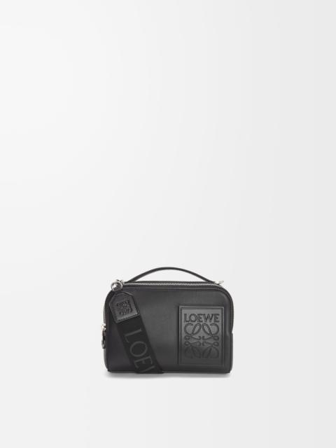 The Puzzle Edge is defined by its distinctive geometric lines and its cuboid form. It differs to the classic construction in its overlapped panels with single stitch lines. This small bumbag version is crafted in grained calfskin. - Shoulder or crossbody carry - Adjustable strap featuring metal clasp closure with engraved LOEWE - Zip closure with calfskin zip pull - One external zip pocket, one internal slip pocket - Herringbone cotton canvas lining - Embossed Anagram Colour: Black Metallic colour: Palladium Main material: Grained Calf Strap length: 88 - 147 cm Strap drop: 40 - 71 cm Weight: 0.53 kg Height: 16 cm Width: 24 cm Depth: 10.5 cm Made in: Spain