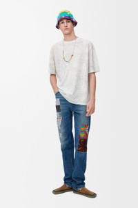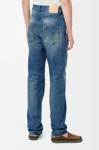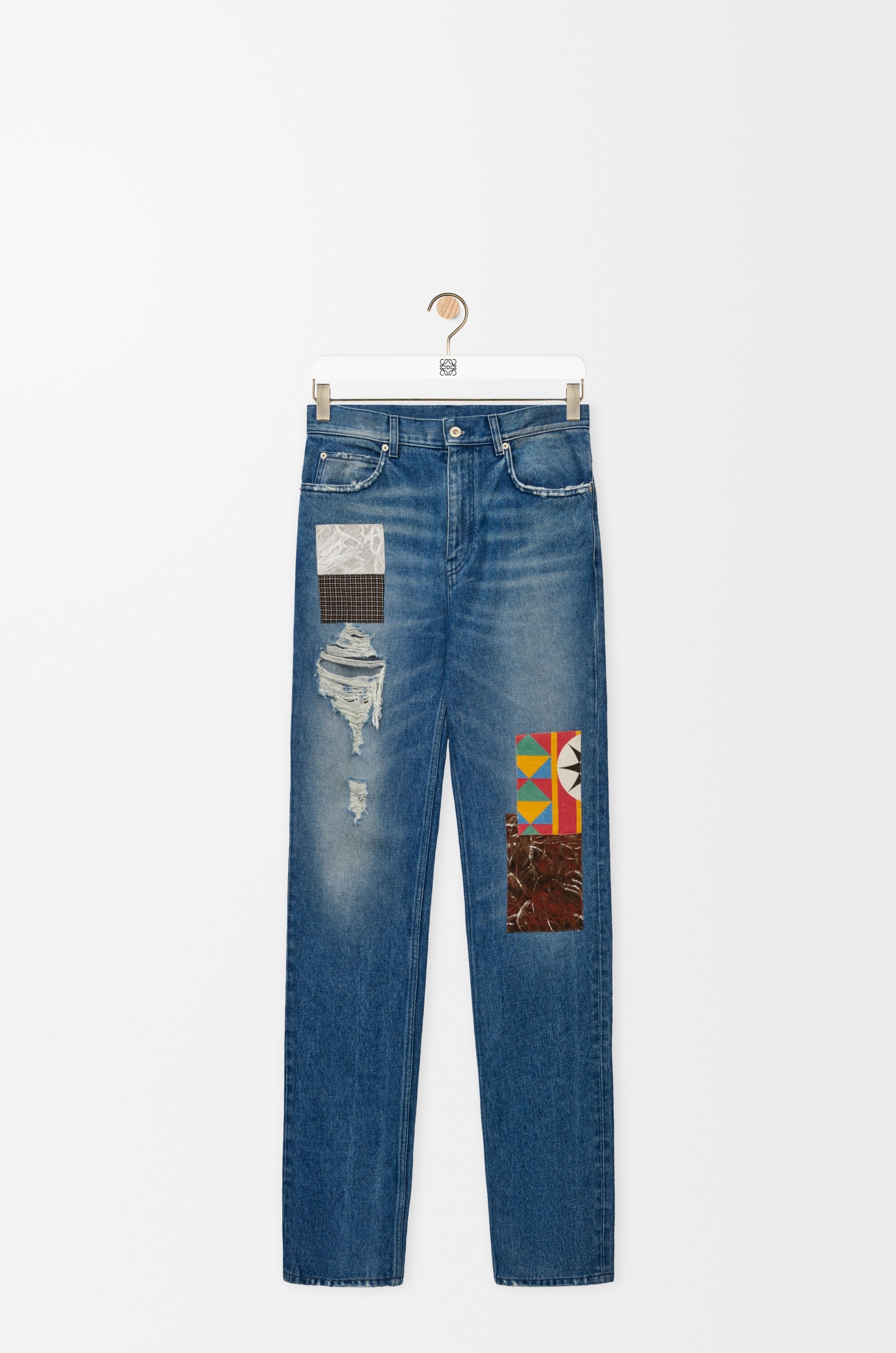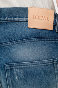 Jeans in medium-weight cotton denim featuring printed patches and allover distressed details. - Regular fit, regular length - Mid waist, straight leg - Concealed zip fly - Five pocket style - LOEWE embossed leather patch placed at the back Colour: Medium Blue Main material: Cotton Weight: 1.0 kg Made in: Italy