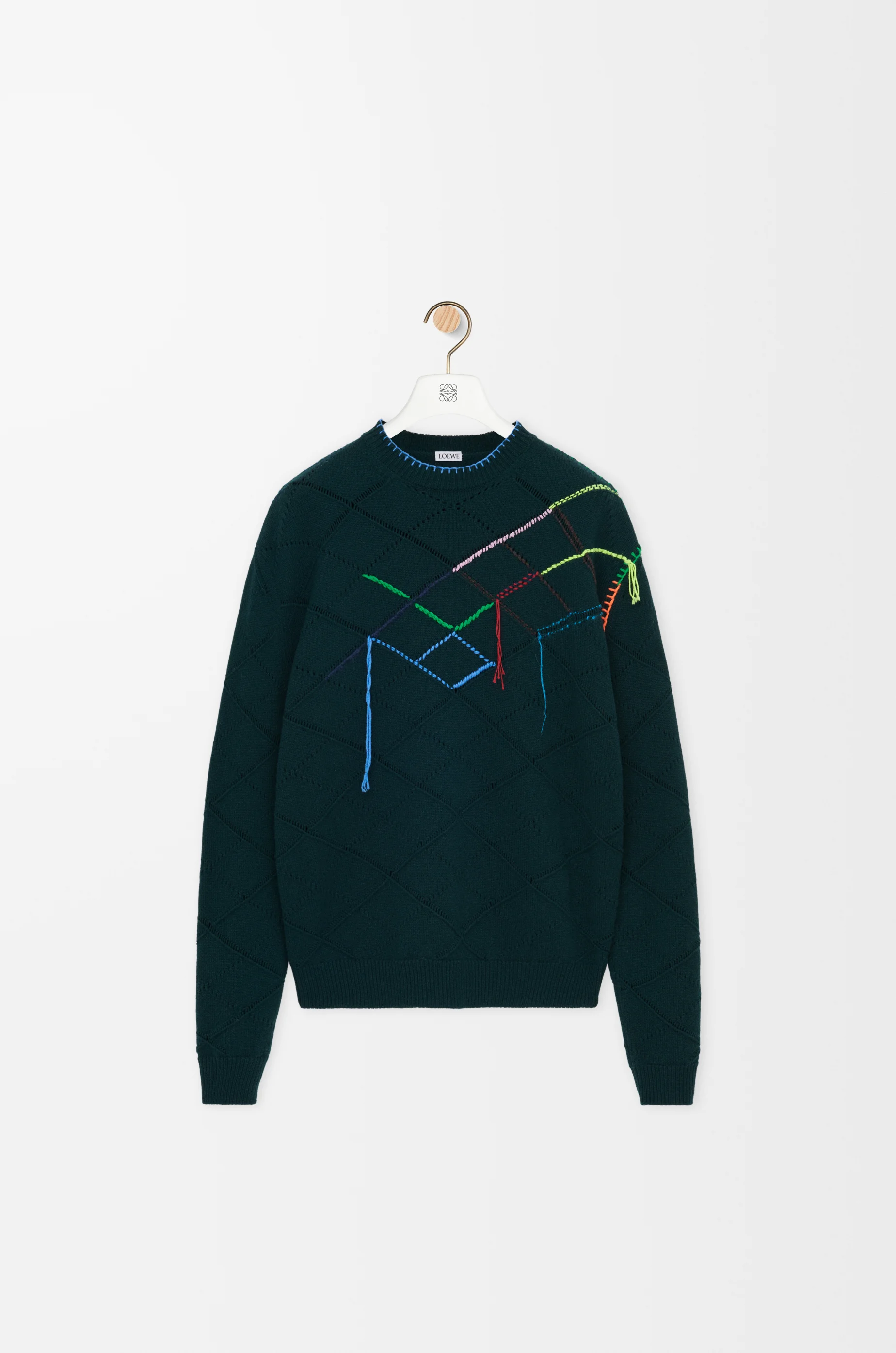 Sweater in medium-weight wool featuring Argyle-inspired hand-embroidery and open stitches. - Regular fit, regular length - Jersey stitch - Round neck with contrast topstitching - Ribbed collar, cuffs and hem Colour: Dark Green/Multicolour Main material: Wool Weight: 0.64 kg Made in: Italy