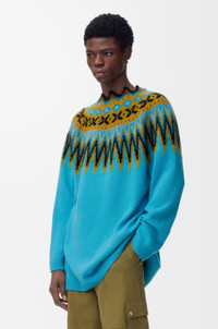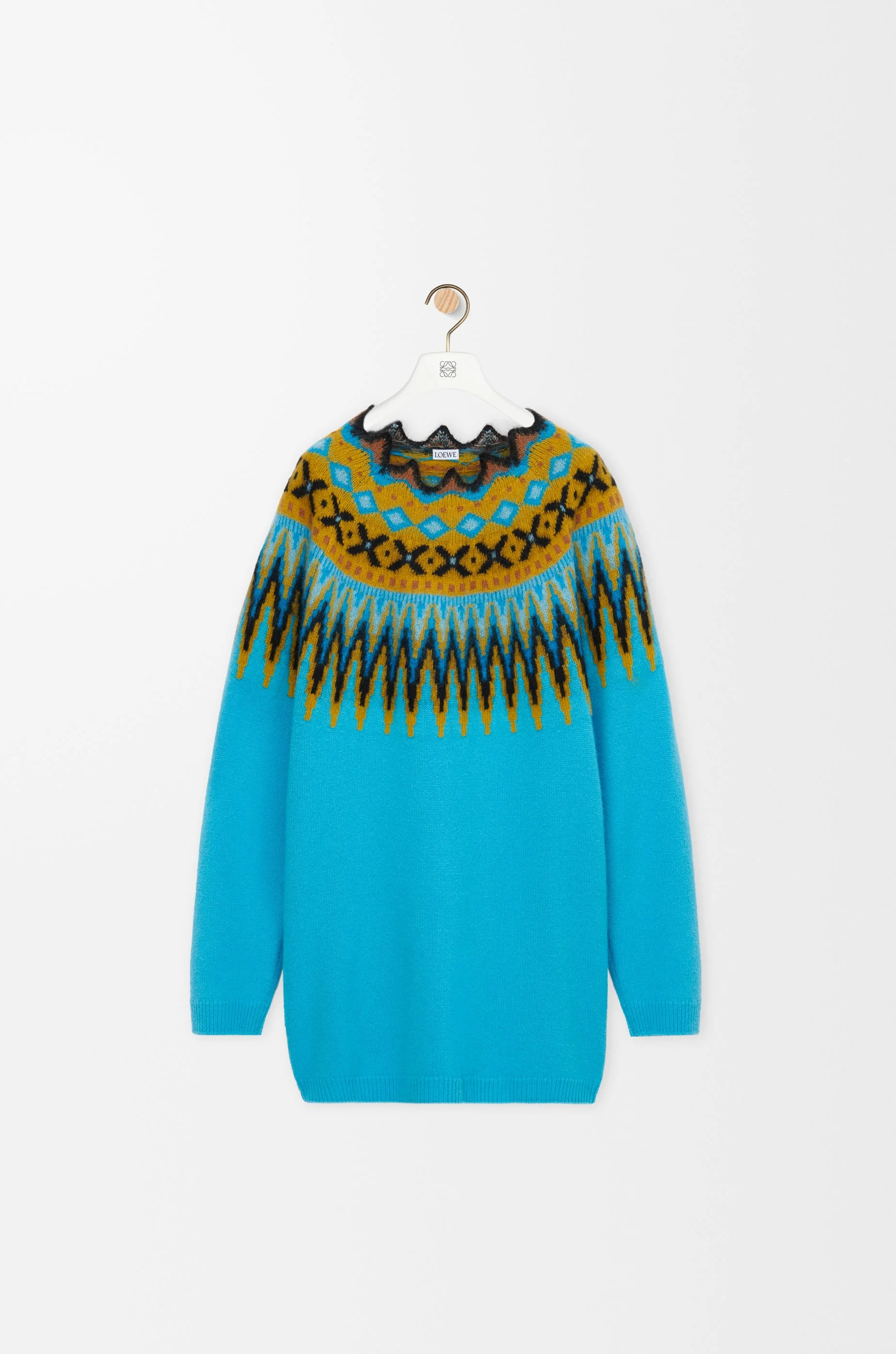 Sweater in medium-weight textured wool and mohair blend featuring a multicoloured mixed motif pattern and a geometric collar. - Relaxed fit, long length - Jacquard and jersey stitch - Ribbed cuffs and hem - Seam pockets Colour: Blue/Multicolor Main material: Wool/Mohair Weight: 0.65 kg Made in: Italy Materials & care Main Material: 83% wool 12% mohair 5% polyamide