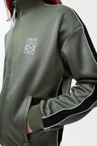 Jacket in lightweight technical jersey featuring herringbone tape on the sleeves and a mesh lining. - Relaxed fit, regular length - High neck - Rib knit collar, cuffs and hem - Zip front fastening - Zipped welt pockets - LOEWE Anagram embroidery placed on the chest Colour: Khaki Green Main material: Polyamide/Cotton Weight: 0.9 kg Made in: Portugal Materials & care Main Material: 56% polyamide 44% cotton