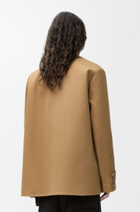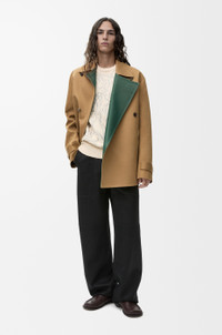 Coat in medium-weight compact cotton bonded with nappa calfskin featuring a double-breasted construction. - Regular fit, short length - Classic collar - Button front fastening, cuff tabs - Welt pockets - LOEWE leather patch placed at the back Details - Colour : Beige/Khaki Green - Main material : Cotton/Nappa - Weight : 1.4 kg - Model ID : H526Y02WBA - Made in : Italy