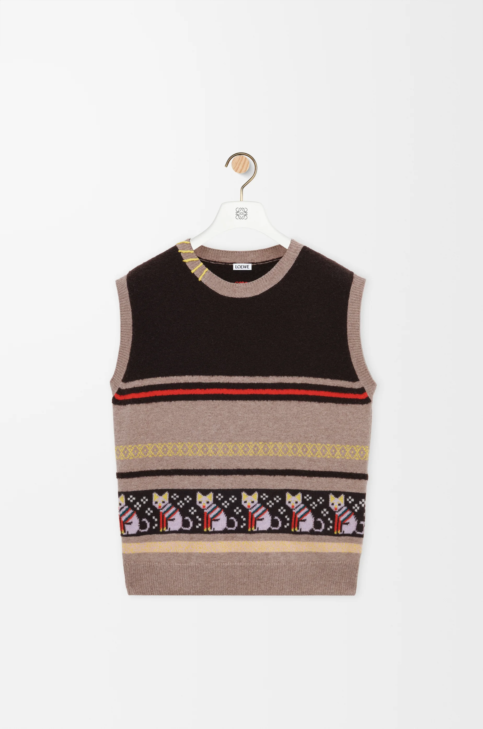 Vest in medium-weight wool and cashmere blend featuring a cat and stripe pattern with mixed yarns. This vest is inspired by Louis Wain's "Futurist Cats" porcelain vase series. - Regular fit, regular length - Jacquard stitch - Round neck with hand-embroidered stripes - Ribbed collar, armholes and hem - Contrast Anagram embroidery placed at the back Colour: Beige/Multicolor Main material: Wool/cashmere Weight: 0.21 kg Made in: Italy Materials & care Main Material: 52% wool 40% cashmere 8% polyamide