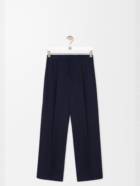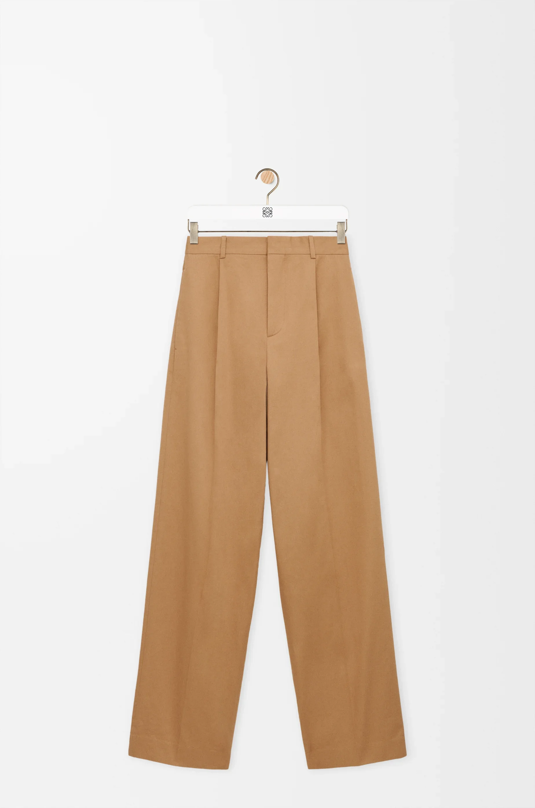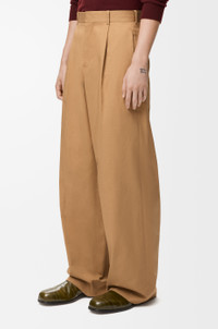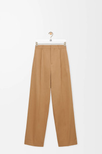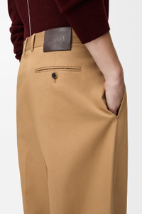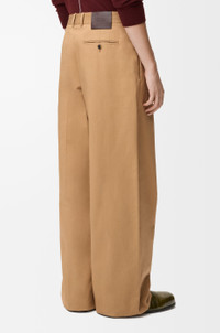 Trousers in lightweight compact cotton gabardine. - Relaxed fit, regular length - Mid waist, wide leg - Concealed zip fly - Seam pockets, buttoned rear welt pocket - Pressed creases at the front and back - LOEWE embossed leather patch placed at the back Colour: Almond Main material: Cotton Weight: 0.47 kg Made in: Italy Materials & care Main Material: 100% cotton