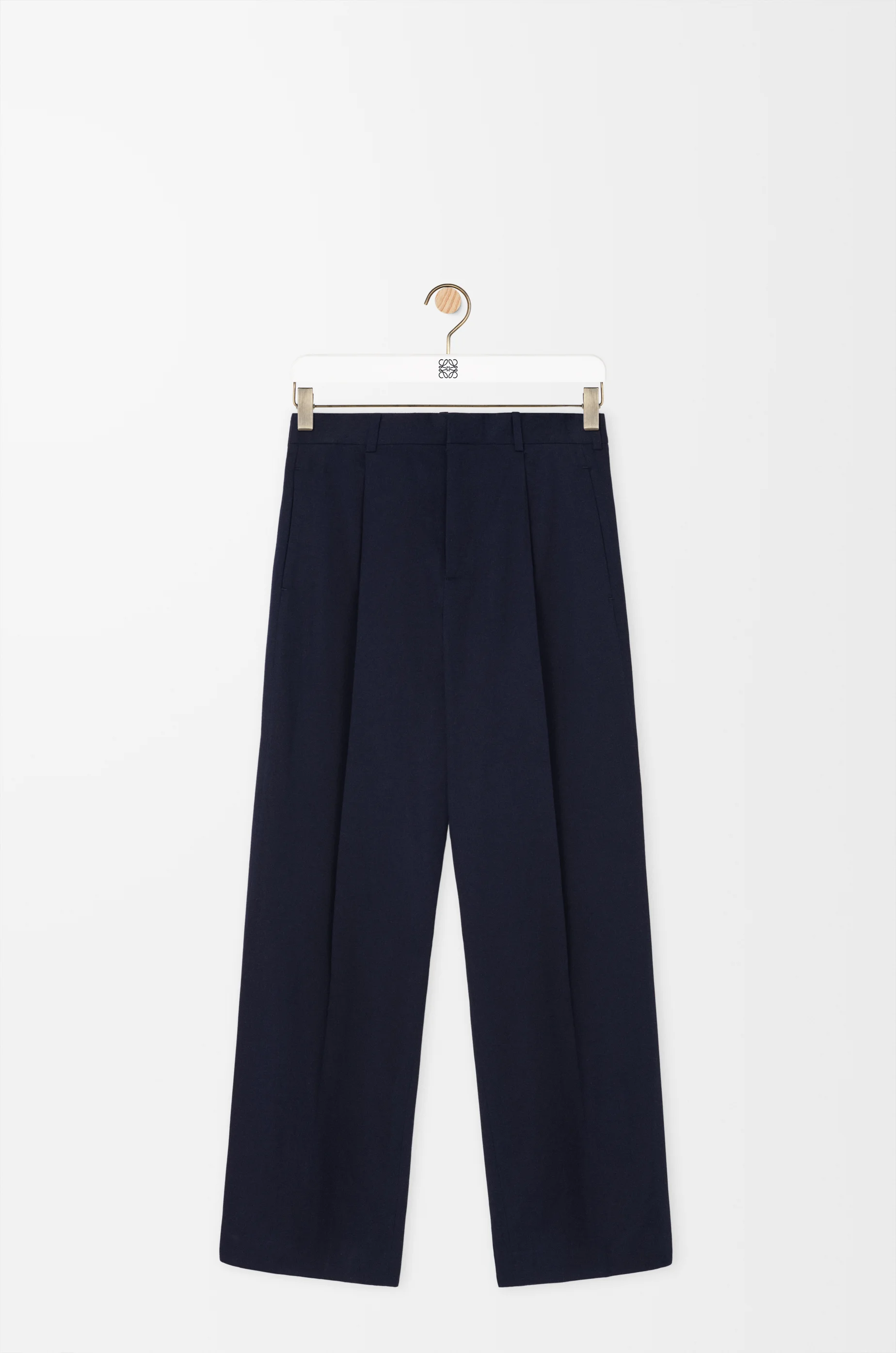 Trousers in lightweight compact cotton gabardine. - Relaxed fit, regular length - Mid waist, wide leg - Concealed zip fly - Seam pockets, buttoned rear welt pocket - Pressed creases at the front and back - LOEWE embossed leather patch placed at the back Colour: Dark Navy Main material: Cotton Weight: 0.47 kg Made in: Italy Materials & care Main Material: 100% cotton
