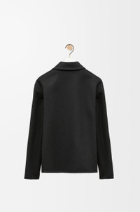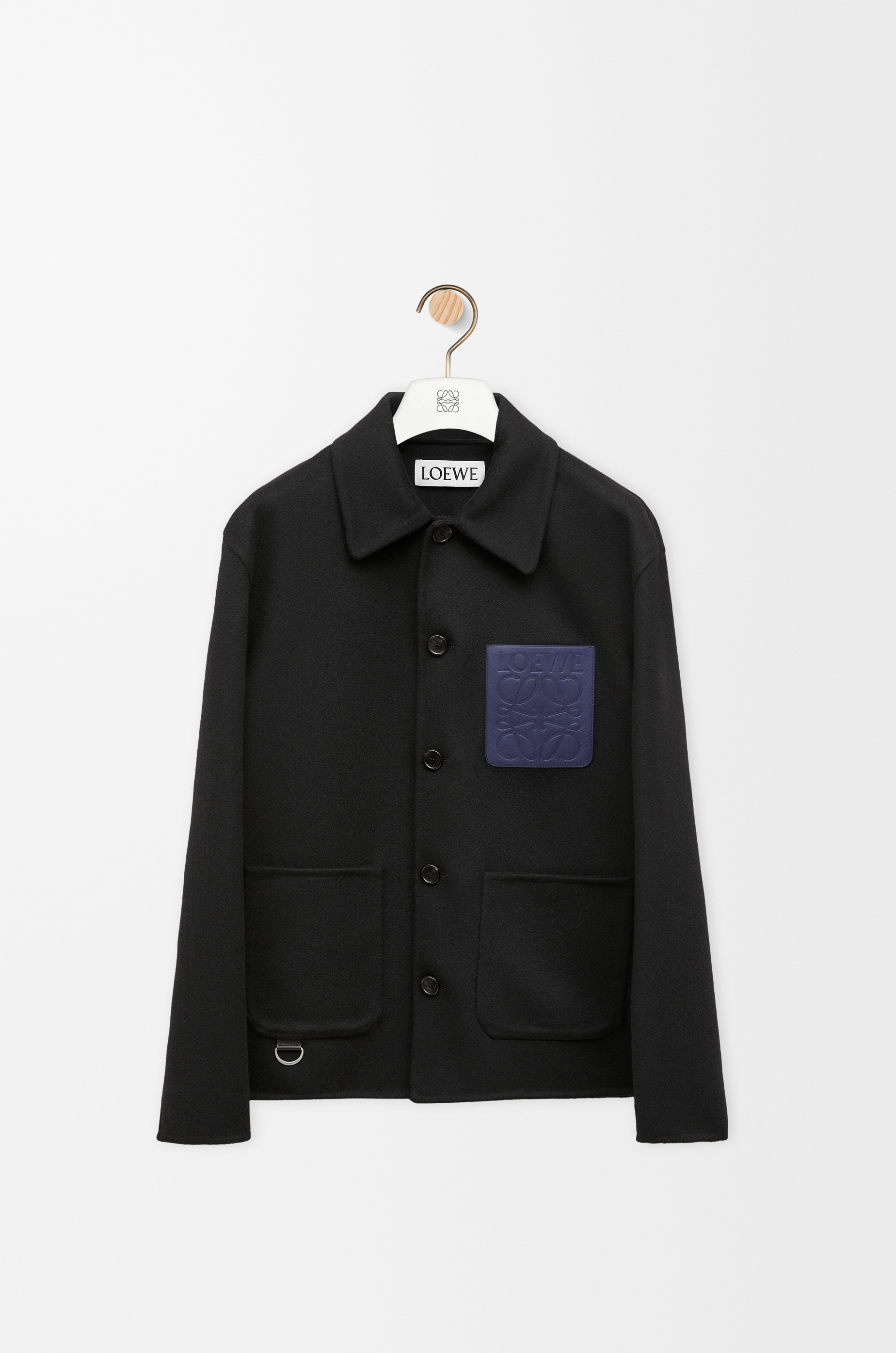 Workwear jacket crafted in double face wool cashmere. - Regular fit - Regular length - Classical collar - LOEWE engraved horn buttons - Button front fastening - Two patch pockets - LOEWE engraved D-ring - LOEWE Anagram embossed leather patch pocket placed on the chest Details - Colour: Black - Main material: Wool/Cashmere - Weight: 0.724 kg - Model ID: H526Y03W76 - Made in: Italy