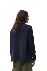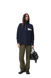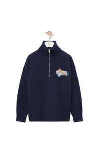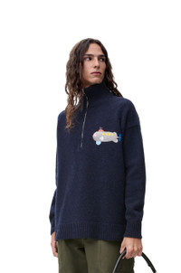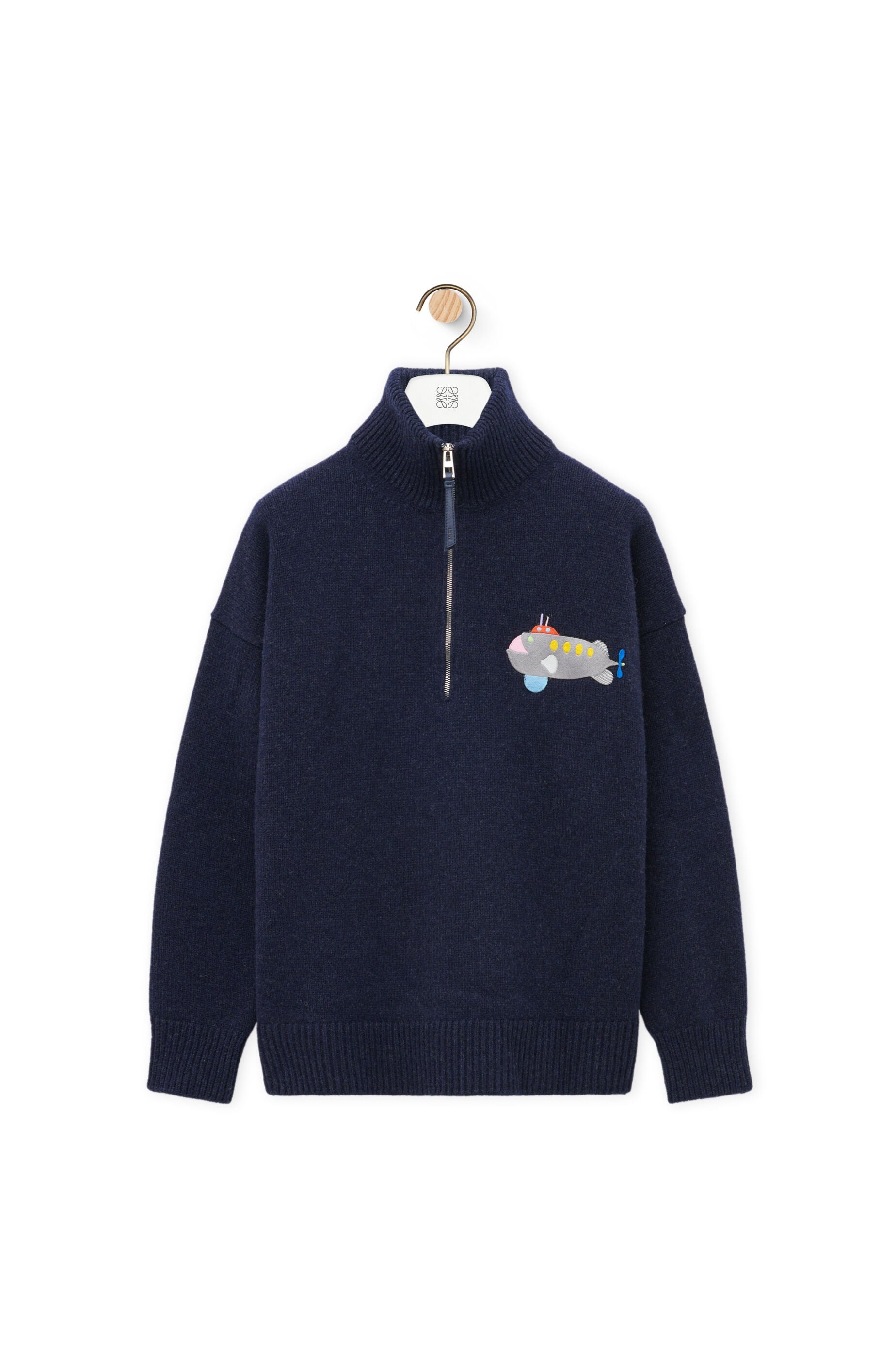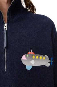 Sweater in medium-weight melange wool melange featuring a Submarine patch on the chest. This sweater is part of the LOEWE x Suna Fujita collection. - Regular fit, regular length - Jersey stitch - Zip-up high neck with leather puller - Ribbed collar, cuffs and hem - Anagram embroidery placed at the back Details - Colour : Dark Blue - Main material : Wool - Weight : 0.8 kg - Model ID : H526Y14KK0 - Made in : Italy