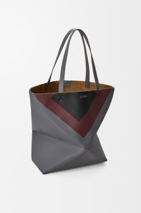 The Puzzle Fold's lightweight geometric structure is designed to fold completely flat, making it a perfect tote to travel with. This XL version is crafted in nappa calfskin with leather marquetry squares inspired by Josef Albers's "Homage to the Square" series. This bag is part of the LOEWE x Albers collection. - Shoulder or hand carry - Suede lining - Embossed LOEWE Colour: Ardesia/Deep Ruby Main material: Nappa Calf Handle drop: 26 cm Weight: 0.732 kg Height: 41 cm Width: 42 cm Depth: 18 cm Made in: Spain