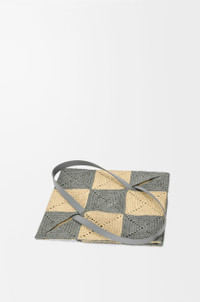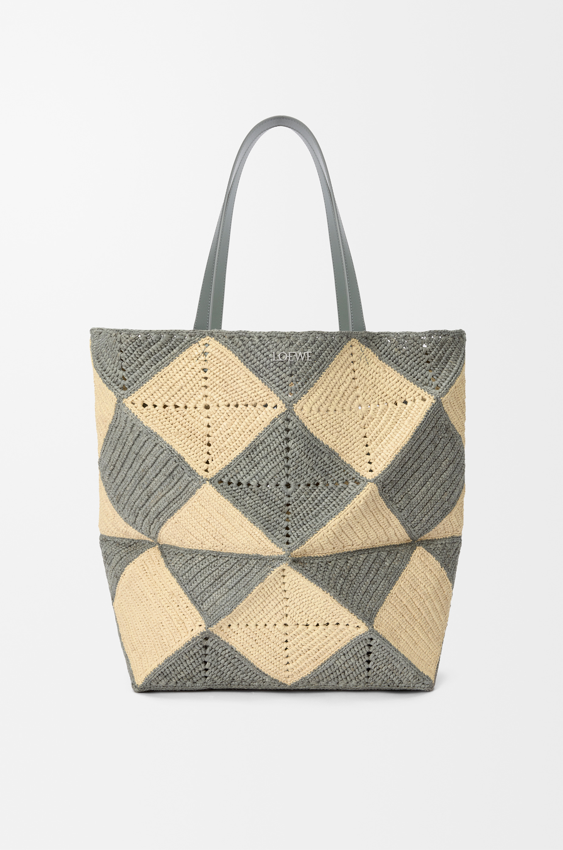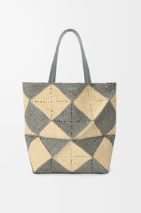 The Puzzle Fold's lightweight geometric structure is designed to fold completely flat, making it a perfect tote to travel with. This XL version features a diamond pattern and is made in Spain using raffia palm leaves cultivated and handwoven by artisans in Madagascar. - Shoulder or hand carry - Unlined - Silver metal LOEWE Colour: Natural/Grey Metallic colour: Palladium Main material: Raffia Handle drop: 26 cm Weight: 0.82 kg Height: 41 cm Width: 42 cm Depth: 18 cm Made in: Spain