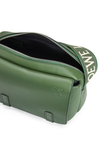 The Military Messenger has a zip top compartment as well as an additional front compartment with a fold over flap. This version is crafted in supple smooth calfskin with a LOEWE jacquard strap. - Shoulder or crossbody carry - Adjustable shoulder strap with metal slider - Magnetic closure - Internal slip pocket - Herringbone cotton canvas lining - Embossed Anagram Details - Colour: Hunter Green - Metallic colour: Palladium - Main material: Supple Smooth Calf/Jacquard - Strap length: 76 - 148 cm - Weight: 0.53 kg - Height (cm): 18 - Width (cm): 23 - Depth (cm): 9 - Height (inch): 7.1 - Width (inch): 9.1 - Depth (inch): 3.5 - Model ID: B553A72X27 - CIL: 0010902914 - Made in: Portugal