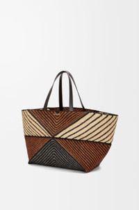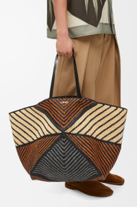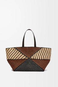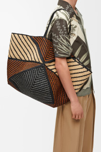 The Puzzle Fold Tote takes the iconic bag’s signature geometric lines and reimagines them in graphic and architectural panels that allow the bag to fold completely flat, making it the perfect travel companion. Soft, lightweight and inventively crafted, it features mixed stripes, calfskin handles and is finished with gold metal LOEWE branding. This XXL version is made in Spain using raffia palm that is cultivated, harvested, sun-dried and woven in Madagascar by local artisans. - Shoulder or hand carry - Unlined - Gold metal LOEWE Details - Colour: Natural/Honey Gold - Metallic colour: Gold - Main material: Raffia - Handle drop: 26 cm - Weight: 1.19 kg - Height (cm): 36.5 - Width (cm): 73 - Depth (cm): 36.5 - Height (inch): 14.4 - Width (inch): 28.7 - Depth (inch): 14.4 - Model ID: B779PFMX15 - CIL: 0011051786 - Made in: Spain