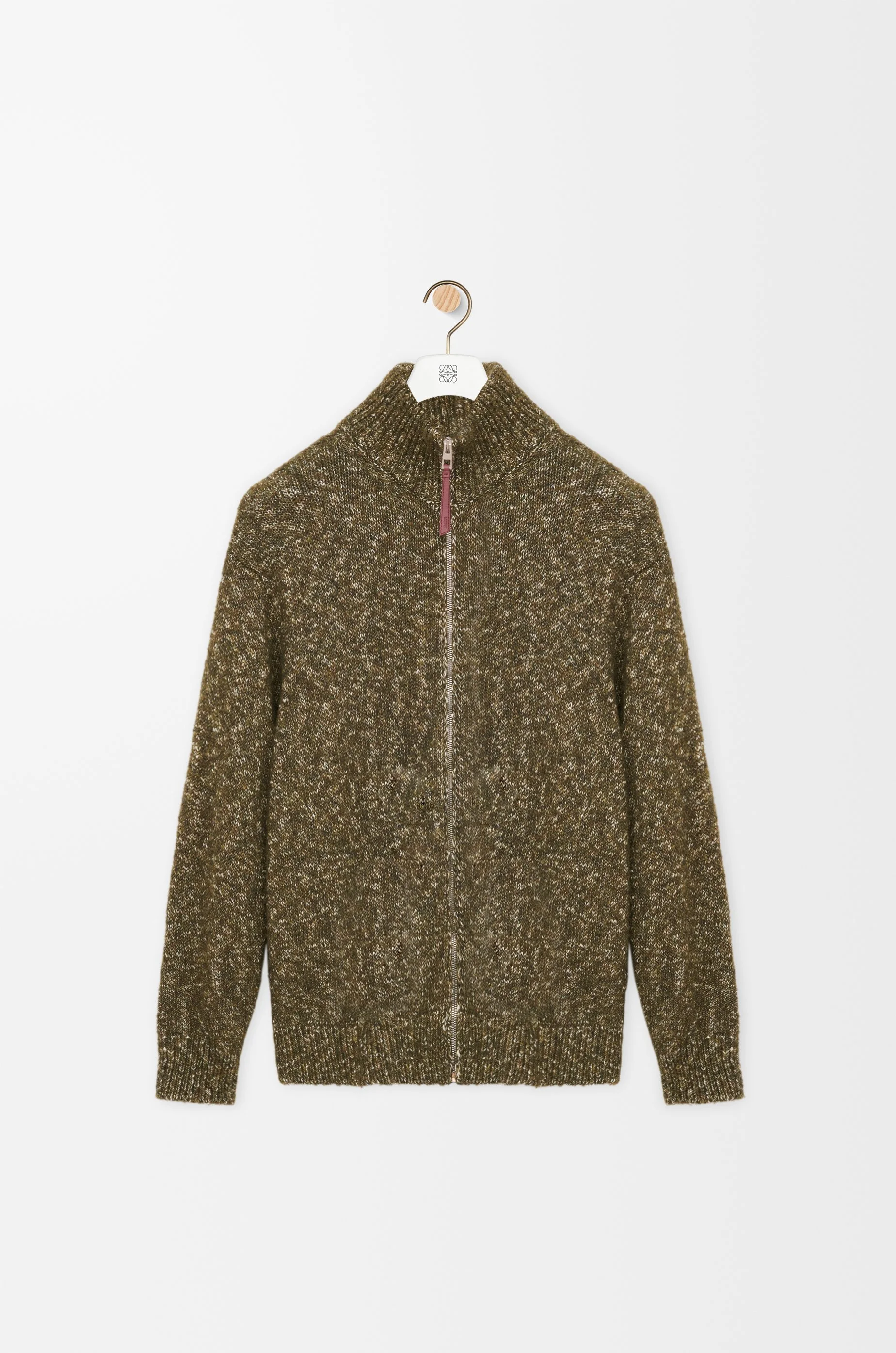 Cardigan in medium-weight cotton, linen and wool blend featuring an oversized LOEWE L intarsia at the back. - Relaxed fit, regular length - Jersey stitch - High neck - Zip front fastening with Puzzle puller - Ribbed collar, cuffs and hem Colour: Khaki Green Main material: Cotton/linen Weight: 0.76 kg Made in: Italy Materials & care Main Material: 39% cotton 20% linen 18% wool 13% polyamide 9% acrylic 1% calf skin 1% other fibers