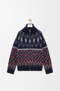 Cardigan in medium-weight wool featuring an allover geometric pattern and raglan sleeves. - Regular fit, regular length - Jacquard stitch - High collar - Ribbed collar, cuffs and hem - Zip front fastening with Puzzle leather puller - Seam pockets Colour: Navy Blue/Grey Main material: Wool Weight: 1.2 kg Made in: Italy Materials & care Main Material: 98% wool 1% polyamide 1% elastane
