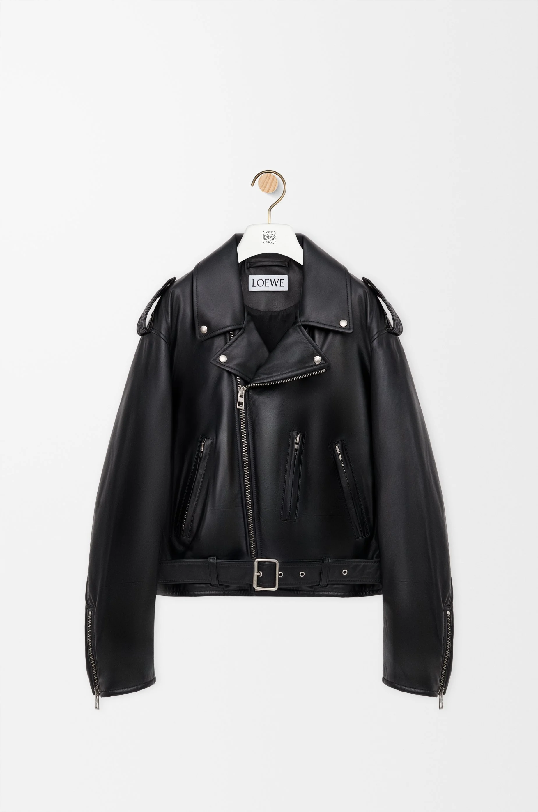 Jacket in super lightweight nappa lambskin featuring a biker silhouette and a Louis Wain digital paint-effect lettering print and embossed Futurist Cat at the back. This jacket is inspired by Louis Wain's "Futurist Cats" porcelain vase series. - Regular fit, regular length - Zip front fastening, zipped cuffs - Multiple zipped pockets - Adjustable belt at the hem - Fully lined - LOEWE Anagram embossed leather patch placed at the back Colour: Black Main material: Nappa Weight: 1.28 kg Made in: Italy Materials & care Main Material: 100% lambskin