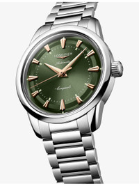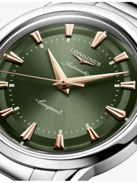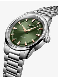 PRODUCT DETAILS - Longines stainless-steel automatic watch - Case material: 100% stainless steel - Strap material: 100% stainless steel - Crown: 100% stainless steel - Bezel: 100% stainless steel - Style Number: L1.649.4.02.6 - Movement type: automatic - Fastening: double security folding clasp with micro adjustment system - Dial: green lacquered polished - Index: applied indexes - Hands: pink hands - Glass: scratch-resistant sapphire crystal, with several layers of anti-reflective coating on both sides - Calibre: L888 - Case thickness: 10.80mm - Case diameter: 38mm - Water resistance: Water-resistant to 5 bar (50m) - Made in: Switzerland - Warranty: 5 years - Returns: warranty card to be included with return Ref: R04525262