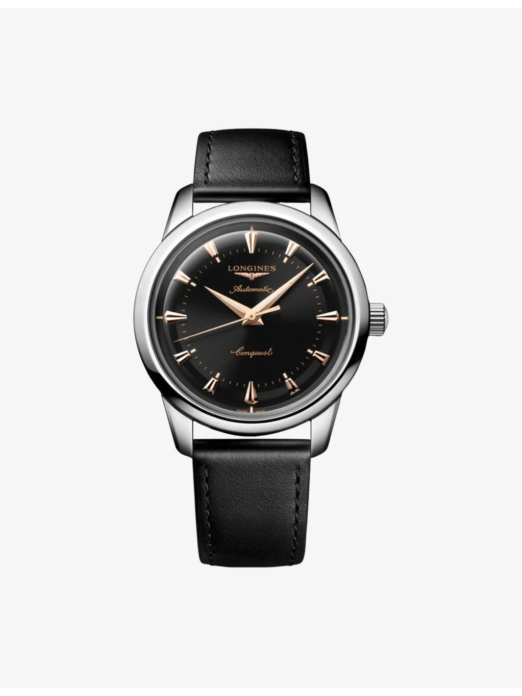 PRODUCT DETAILS - Longines stainless-steel automatic watch - Case material: 100% stainless steel - Strap material: 100% leather - Crown: 100% stainless steel - Bezel: 100% stainless steel - Style Number: L1.650.4.52.2 - Movement type: automatic - Fastening: buckle - Dial: black lacquered polished - Index: applied indexes - Hands: pink hands - Glass: scratch-resistant sapphire crystal, with several layers of anti-reflective coating on both sides - Calibre: L888 - Case thickness: 10.80mm - Case diameter: 40mm - Water resistance: water-resistant to 5 bar (50m) - Made in: Switzerland - Warranty: 5 years - Returns: warranty card to be included with return Ref: R04525267