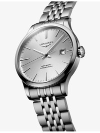 PRODUCT DETAILS - Longines Stainless-Steel Automatic Watch - Case material: 100% stainless steel - Strap material: 100% stainless steel - Crown: 100% stainless steel - Bezel: 100% stainless steel - Style Number: L2.821.4.72.6 - Movement type: automatic - Fastening: triple safety folding clasp and push-piece opening mechanism - Dial: sunray silver - Index: applied indexes - Hands: silvered polished hands - Glass: scratch-resistant sapphire crystal, with several layers of anti-reflective coating on the underside - Calibre: L888.4 - Case thickness: 10.80 mm - Case diameter: 40.00 mm - Technical details: COSC Certified and date - Water resistance: Water-resistant to 3 bar (30 m) - Made in: Switzerland - Warranty: 5 years - Returns: Warranty card and COSC Certificate to be included with return Ref: R04473872