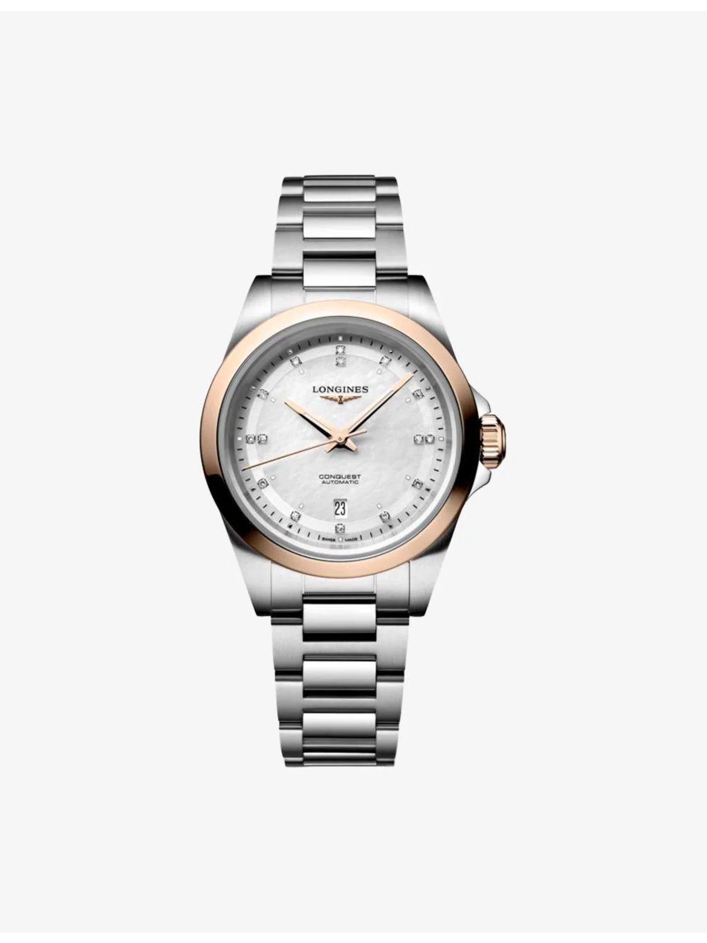 PRODUCT DETAILS - Longines stainless-steel and 18ct rose gold automatic watch - Case material: 100% stainless steel; 100% 18ct rose gold cap - Bezel: 100% stainless steel - Strap material: 100% stainless steel - Style Number: L3.320.5.87.6 - Movement type: automatic - Fastening: triple safety folding clasp and push-piece opening mechanism - Index: Applied indexes - Hands: Pink hands - Glass: Scratch-resistant sapphire crystal, with several layers of anti-reflective coating on both sides - Calibre: L592 - Case thickness: 9.70 mm - Case diameter: 30.00 mm - Water resistance: Water-resistant to 10 bar (100 m) - Made in: Switzerland - Warranty: 5 years - Returns: Warranty card & diamond certificate to be included with return. Ref: R04525235