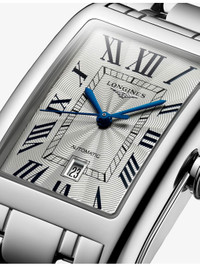 PRODUCT DETAILS - Longines stainless-steel automatic watch - Case material: 100% stainless steel - Strap material: 100% stainless steel - Crown: 100% stainless steel - Bezel: 100% stainless steel - Style Number: L5.757.4.71.6 - Movement type: automatic - Fastening: triple safety folding clasp and push-piece opening mechanism - Dial: silver ""flinque"" - Index: painted Roman numerals - Hands: blued steel hands - Glass: scratch-resistant sapphire crystal - Calibre: L592 - Case thickness: 10.10mm - Case diameter: 27.70 X 43.80mm - Technical details: date - Water resistance: water-resistant to 3 bar (30m) - Made in: Switzerland - Warranty: 5 years - Returns: warranty card to be included with return Ref: R04525275