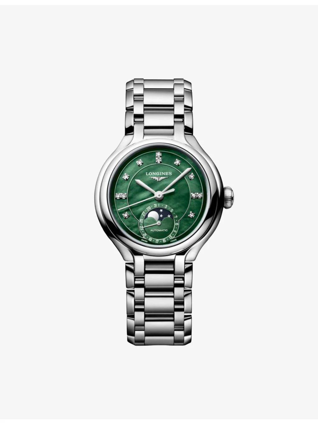 PRODUCT DETAILS - Longines stainless-steel and 0.051ct diamond automatic watch - Case material: 100% stainless steel - Strap material: 100% stainless steel - Crown: 100% stainless steel - Bezel: 100% stainless steel - Style Number: L8.124.4.97.6 - Movement type: automatic - Fastening: with triple safety folding clasp and push-piece opening mechanism - Dial: vivid green mother-of-pearl - Index: diamond indexes - Hands: silvered polished hands - Glass: scratch-resistant sapphire crystal, with several layers of anti-reflective coating on both sides - Calibre: L899.5 - Case thickness: 11.60mm - Case diameter: 34mm - Stones: 12 Top Wesselton VS-SI diamonds, totalling 0.051ct - Technical details: Moon phase function at 6 o'clock - Water resistance: water-resistant to 3 bar - Made in: Switzerland - Care: please refer to the brand's instructions - Warranty: 5 years - Returns: warranty card and diamond certificate Ref: R04584658