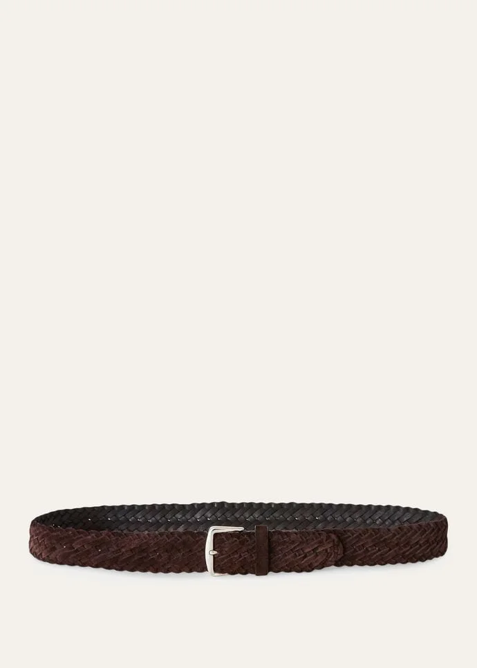 Belt in suede plaited by hand. Treated with a water-repellent, stain-resistant finish, it features a palladium finish buckle and the Loro Piana logo. Product details Width: 3.5 cm Hand stitching, two stitches in kummel colour thread One fixed loop Composition: 100% suede calfskin Made in Italy Product code: FAL6258