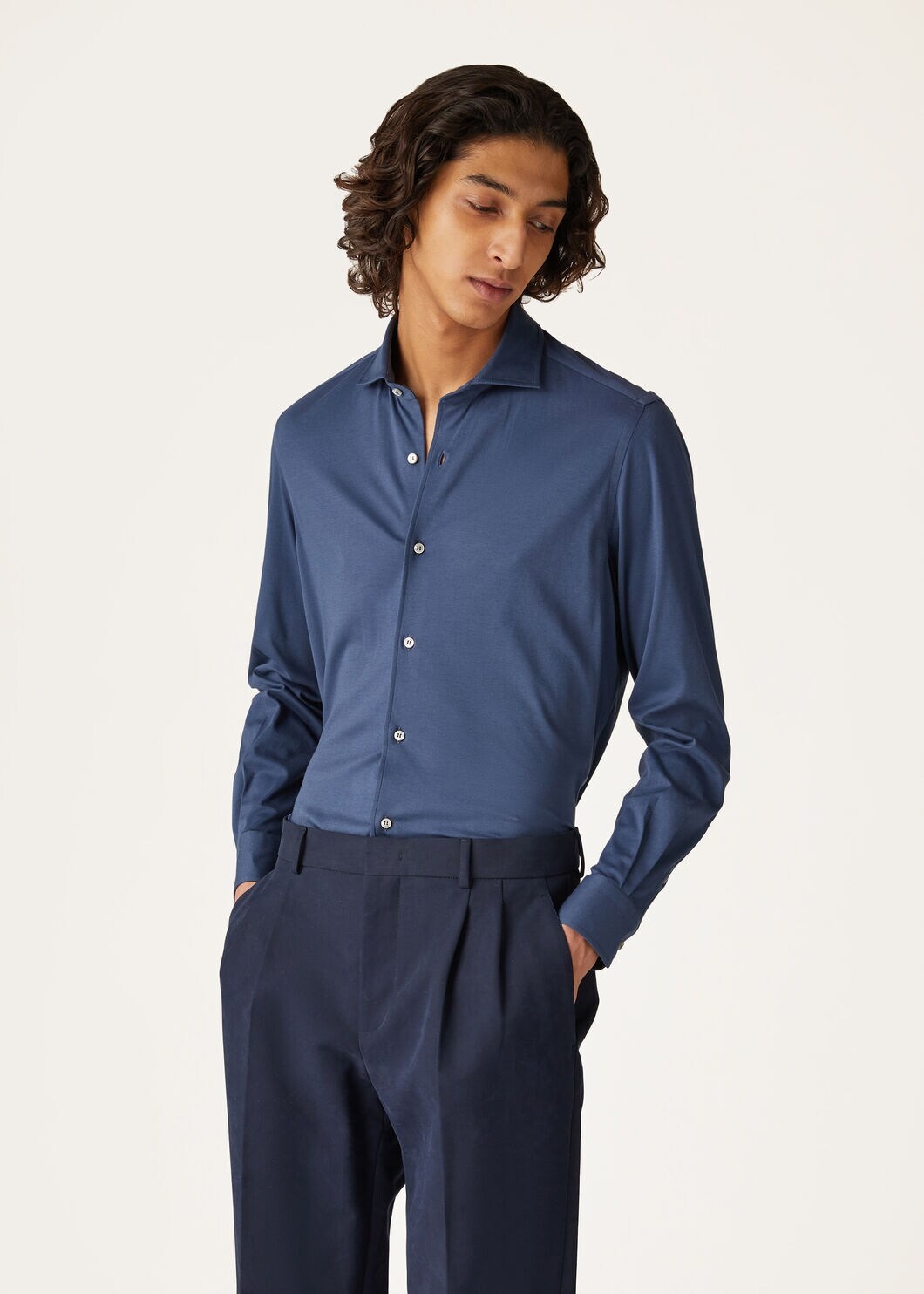 Shirt in super-soft cotton jersey styled with a fitted cut. A light-weight, versatile wardrobe essential. Product details Length: 78 cm, half chest: 56 cm, sleeve length: 67 cm, shoulder width: 46 cm - Measurements refer to size M/41 Narrow spread collar Two pleats on back Two pleats on cuffs Composition: 100% cotton Model wears an IT M Model measures: height 6' 2.8"/ 190cm, bust 35.0"/ 89cm, waist 31.5"/ 80cm, hips 35.0"/ 89cm. Made in Italy Product Code: FAL6123