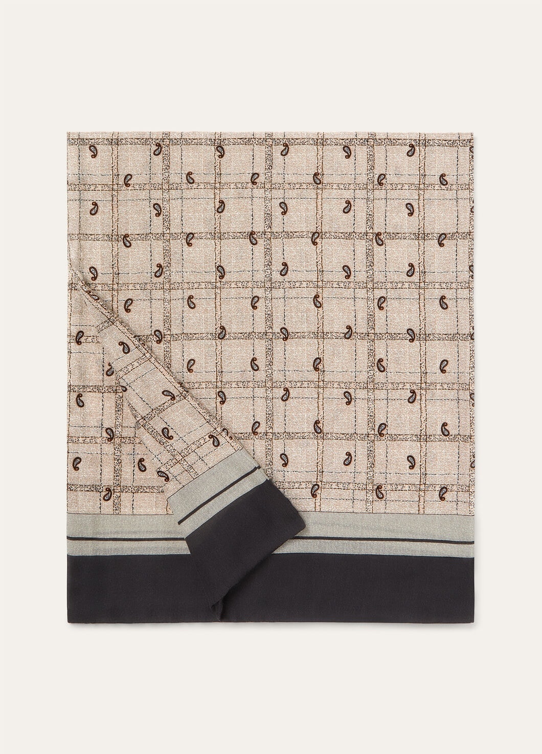 The Boteh scarf reflects Loro Piana’s rich heritage, beautifully complementing any ensemble with understated finesse. Crafted from a luxurious blend of cashmere and silk, the scarf features a check base with an all-over paisley design, an intricate pattern created using a complex screen printing technique. The soft, supple texture of the cashmere and silk combined with the rich, vibrant colors of the paisley motif create a visually stunning accessory. Product details Folded on one long side and stitched on the other long side Slit at the ends Size: 155 x 45 cm / 61 x 17.7 in Composition: 70% Cashmere, 30% Silk Product code: FAP1980
