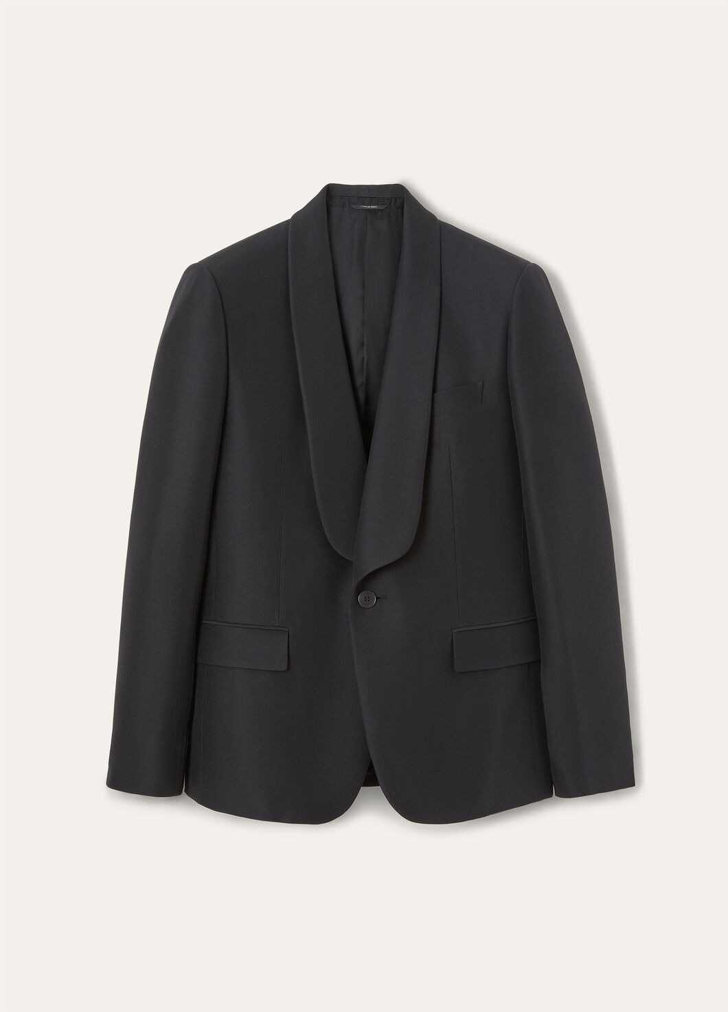 With each precisely tailored element, the Daniele jacket transforms the wearer into the embodiment of distinguished refinement. The single-breasted tuxedo design is crafted from a sophisticated blend of silk and wool, with a shawl collar and rounded front hem to create a fluid silhouette. The slightly oversized fit and flapped welt pockets add a contemporary touch to what is a classic piece. Product details Edged breast pocket Lower double welt pockets with flap Regular shoulders Inset sleeve with vent at cuff, fastened with kissing buttons Center seam and back vent Shaped facing Composition: 80% Wool, 20% Silk Product code: FAO7879