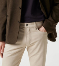 Product Details - Material: 99% cotton, 1% elastane - Care instructions: machine wash at 30 degrees - Made in Italy - Designer color name: Beige - Item color: beige - Details: 100% calf leather - Lining: 65% polyester, 35% cotton - Item number: P01069082 Size & Fit - Fits small to size - we recommend trying one size larger - Non-stretchy fabric - Straight leg - Mid-rise - The model in the picture is 185cm-6'1" and wearing a size 33