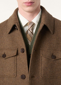 Crafted from a double-layered blend of Wish® wool and cashmere, the Devis Caban is the epitome of warmth and style. It is woven with a subtle herringbone motif, enriched through fulling and brushing to evoke the soft density of Melton felt. The caban silhouette is finished with leather-trimmed interior pockets for a discreet note of sophistication. Product details Shirt collar Two patch chest pockets with flap and button, two patch side pockets; leather interior patch pocket Shirt cuffs with button Button fastening, leather-covered buttons Loro Piana logo on the buttons Lined Regular fit Herringbone fabric Composition: 90% Virgin Wool, 10% Cashmere Model wears an IT 48 Model measures: height 6′ 2″/ 189cm, bust 37.4″/ 95cm, waist 30.3″/ 77cm, hips 37.4″/ 95cm, shoes 18.1″/ 46cm. Made in Italy Product code: FAP8007