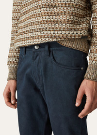 Five-pocket trousers made from garment-dyed cotton denim. This regular-fit style is defined by sophisticated details and a modern allure. Product details Length: 104 cm (40.9”); Cuff Width: 17 cm (6.7”); Crotch: 23.5 cm (9.3”) for a US Size 16/Medium Cashmere tag with embroidered, kummel-coloured Loro Piana logo on the inner waistband Small front watch pocket Bartack stitches in kummel-coloured yarn Composition: 99% Cotton, 1% Elastane Specific Features: 100% Calfskin Model wears an IT 33 Model measures: height 6′ 3″/ 190cm, bust 35.0″/ 89cm, waist 31.5″/ 80cm, hips 35.0″/ 89cm. Made in Italy Product code: FAM5352