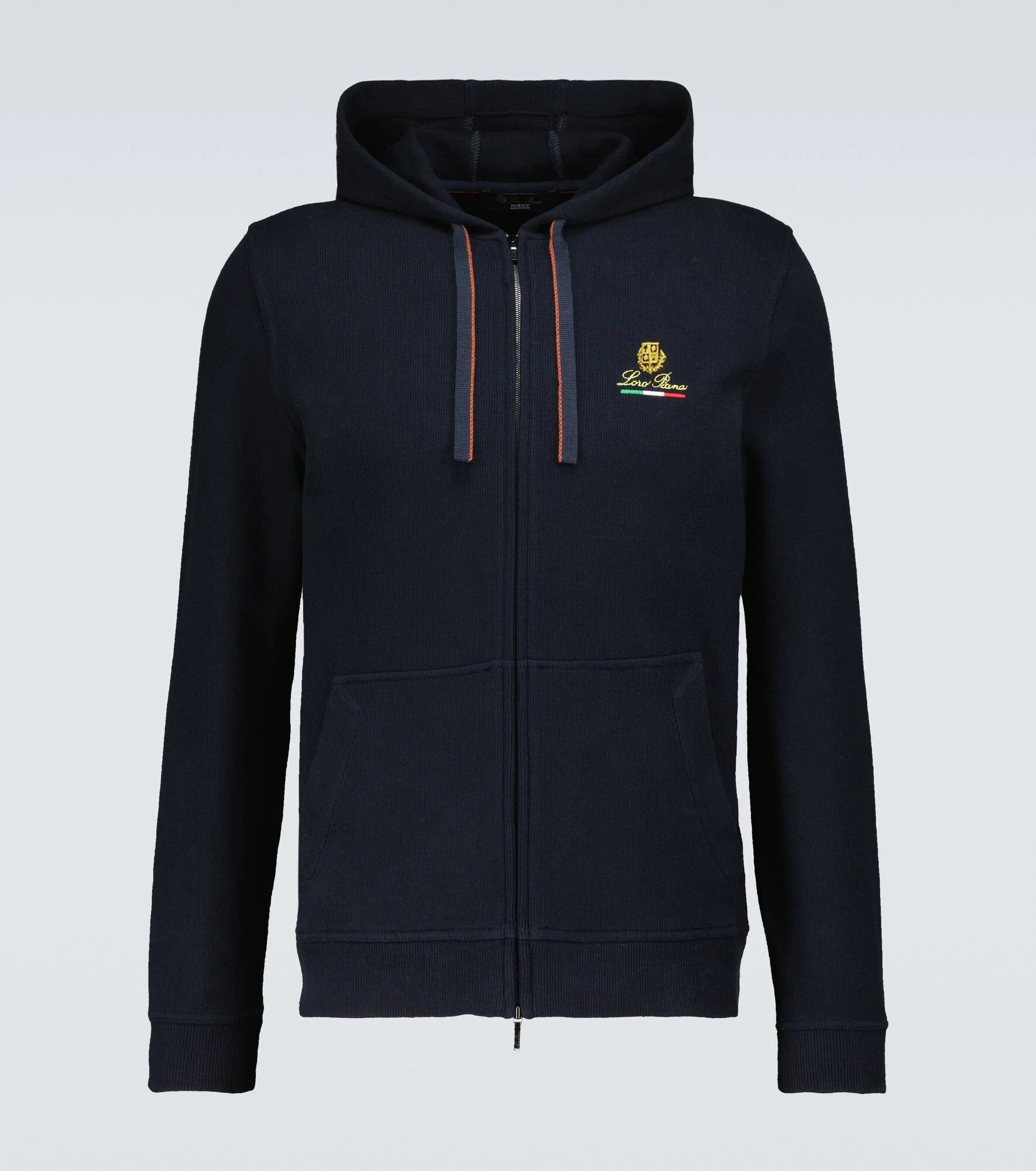 Loro Piana crafts this navy blue sweatshirt from cotton jersey, offering a relaxed fit, hood, zipped front fastening, and is accented with a logo embroidery at the chest. Product Details - Material: 100% cotton - Care instructions: hand wash - Made in Italy - Designer color name: Blue Navy - Closure: two-way zipped front - Drawstring hood - Pockets: side slit pockets - Item number: P00522569 Size & Fit - True to size - Designed for a loose fit - Slightly stretchy fabric - Falls to the hip - The model in the picture is 185cm-6'1" and wearing a size M