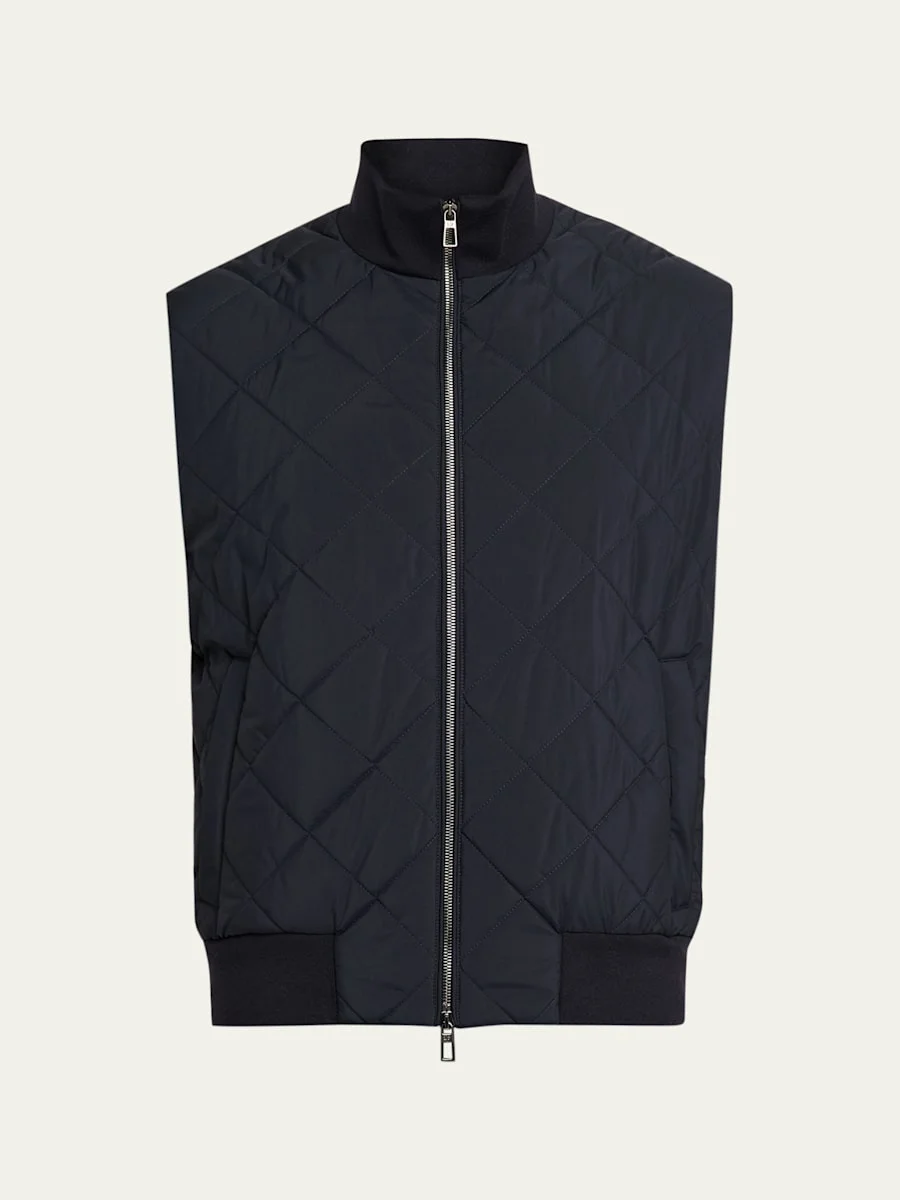 The "Ampay" vest by Loro Piana is crafted in WindWish™ microfiber, framed by Wish® wool and diamond-quilting to distribute gentle warmth Water-repellent and wind-resistant Ribbed high neck Two-way zip front Side zip pockets Inner welt pockets Sleeveless Ribbed hem Regular fit Lining: Virgin wool/elastane Dry clean Trim: Leather Made in Italy Online Inquiries: BGS21_NDQ9Y| Store Inquiries: #5066099