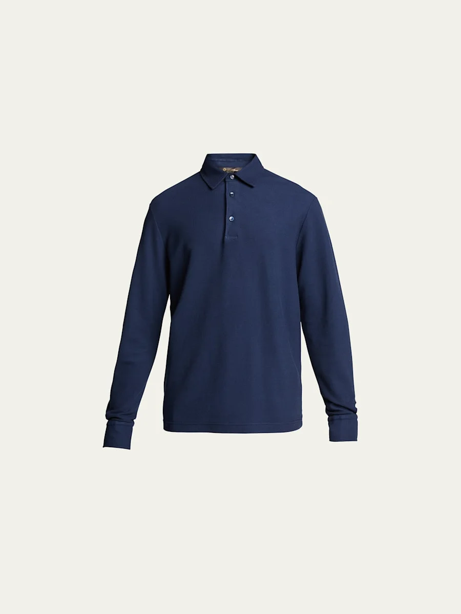Loro Piana pique polo shirt. Spread collar; threebutton placket. Long sleeves; barrel cuffs. Pullover style. Straight hem. Cotton. Imported.