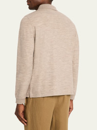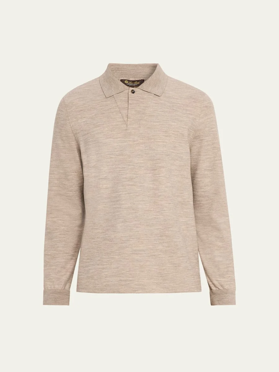 The "Taieri" polo shirt by Loro Piana in Pecora Nera® evokes the beauty of the darkfleeced Merino sheep, resulting in a dimensional melange effect. Open polo collar; single button Thick, ribbed cuffs Long sleeves Vented sides Pullover style Virgin wool/nylon/polyamide Dry clean Made in Italy