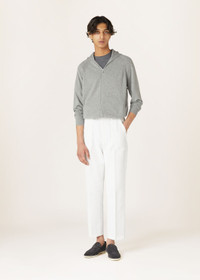 Hooded bomber jacket made from extremely lightweight baby cashmere yarn. When worn with matching Merano pants, this flowing, sporty style creates a comfortable athleisure tracksuit. Product details The model is wearing a US Size 16/M Its rare, ultra-soft baby cashmere fibers are solely obtained from the undercoat of baby Capra hircus goats Zipped closure Raglan sleeves Ribbed zipper trim, cuffs, hem and hood Composition: 100% Baby Cashmere Model wears an IT S Model measures: height 6′ 3″/ 190cm, bust 35.0″/ 89cm, waist 31.5″/ 80cm, hips 35.0″/ 89cm. Made in Italy Product code: FAM1820