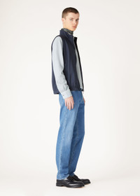 This sleeveless version of the iconic Loro Piana reversible bomber is designed for seamless layering. Featuring an outer in Wind Stretch Storm System® microfiber and Wish® wool inner, it is exceptionally lightweight but delightfully warm with a classic close fit that makes it perfect for wearing on its own or under an outer layer without creating a bulky silhouette. Split pockets add further practicality, while the upright collar provides additional protection from the wind. Product details Upright collar with zip Sleeveless Full frontal zip Slit pockets on both sides Composition: Side 1: 100% Microfiber Side 2: 100% Wool Made in Italy Product code: FAP9759