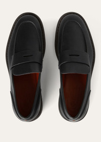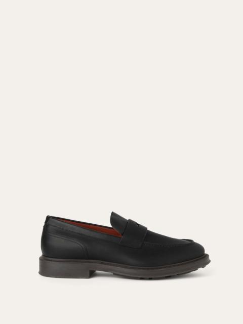 Inspired by classic English footwear, these new Loro Piana loafers combine a sophisticated, comfortable design and masculine allure with the modern look of highly accentuated, lightweight lug soles. They are crafted from calfskin with a unique finish, making them extremely soft while preserving the natural qualities of the leather. Their slightly lived-in look adds a touch of refined elegance to casual outfits. Product details Double-stitched mustache and handsewn trim The soles feature a new version of the LP logo Composition: 100% Calfskin Specific Features: Lining: 100% Calfskin; Soles: 100% Rubber Made in Italy Product code: FAN5630