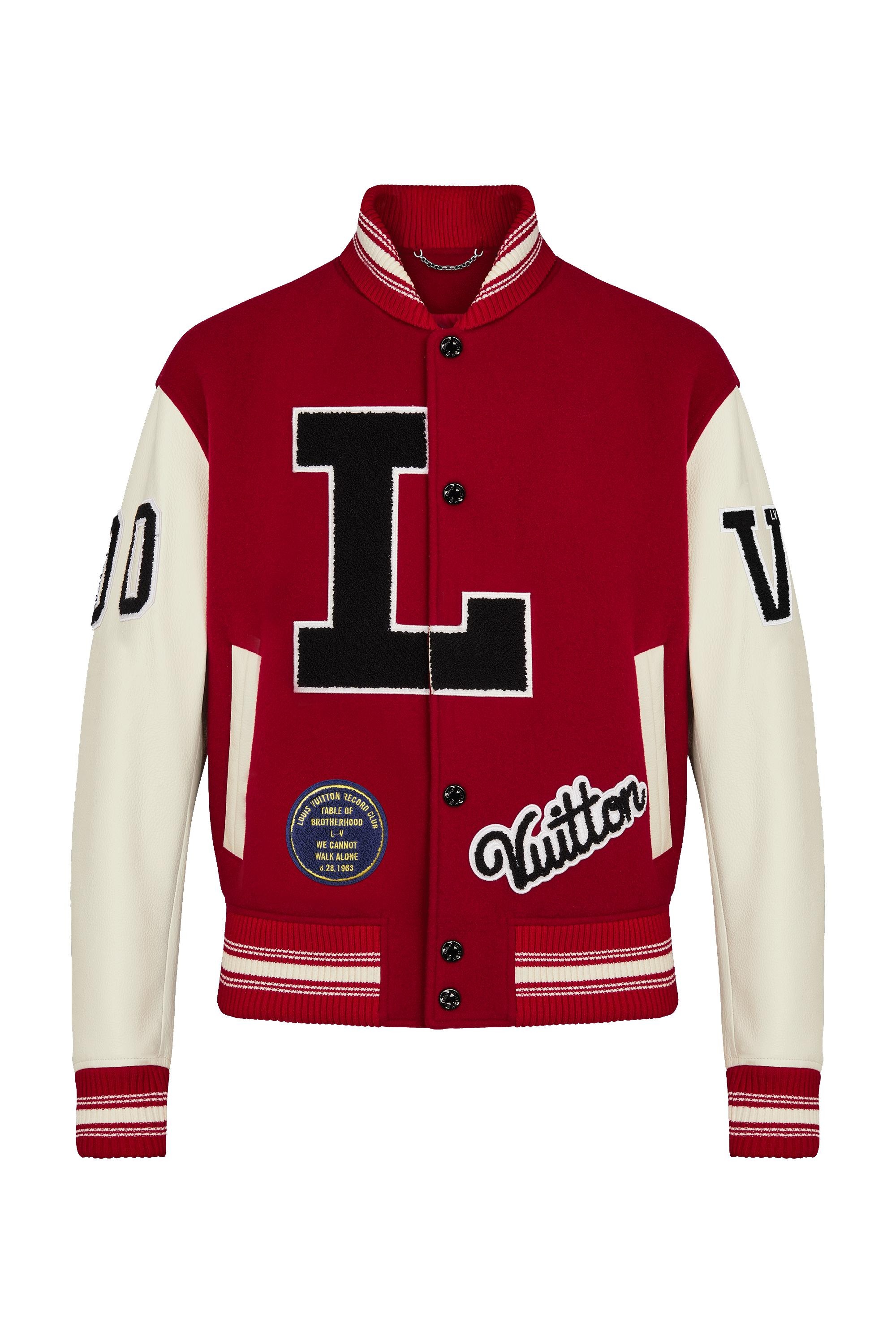 This Baseball Jacket With Patches reinterprets a casual classic with the season’s graphic Dr. Martin Luther King, Jr. - inspired patches. Echoing real baseball jackets, it combines a luxurious wool and cashmere body with soft cowhide sleeves. The cut is rounded and regular-fitting, with LV lettering and signature distorted metallic hardware adding the finishing touch. Detailed Features - 100% Cowskin - Lining : 70% Cupro, 30% Cotton - Red - Regular Fit - Model wear a FR 48 size - Model measurements : chest 32’’ / 82 cm, height 6’’ / 183 cm. - Made in Italy