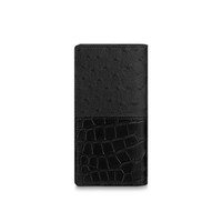 Louis Vuitton’s bestselling Brazza wallet enters a new realm of high-end luxury with a blend of three sumptuous leathers. Exotic alligator is combined with ostrich hide and the House’s signature Taurillon Monogram calfskin, all in elegant matte black. And inside, it’s an ultra-practical wallet, with an array of card slots and compartments for cash and coins. Detailed Features - Matte black - Crocodilian, ostrich and Taurillon Monogram calf leather - Crocodilian leather trim - Goat leather lining - Silver-color hardware - 16 credit card slots - ID or business card slot - Gusseted bill compartment - 4 inside flat compartments for banknotes and tickets - Large zipped coin compartment - This reference is either Made in France, Spain, Italy or in the US. Length: 3.9 inches Height: 7.5 inches Width: 0.8 inches