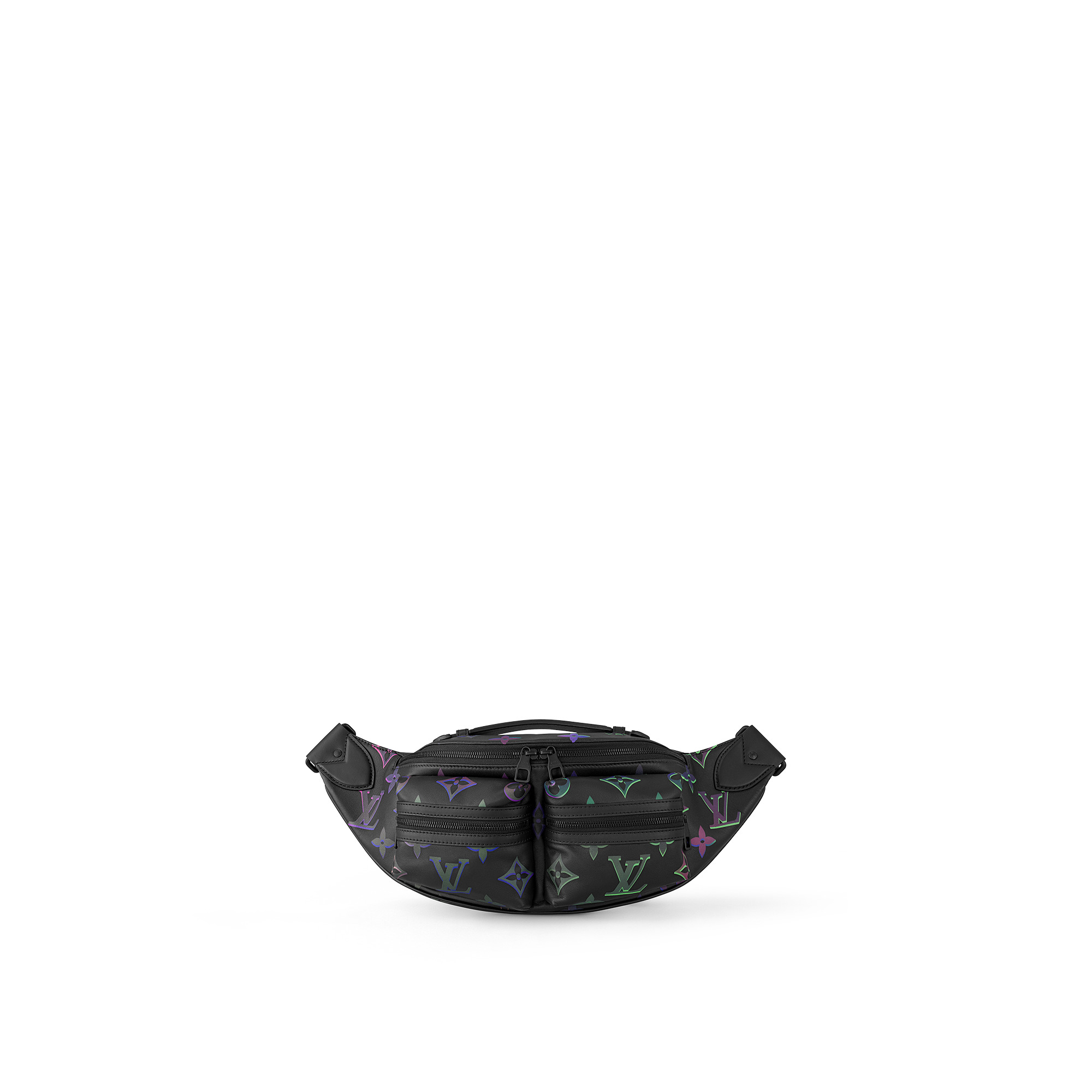 The supple calf leather brings a sporty modernity to the shape of the Comet Bumbag. The calfskin features the Monogram Spotlight print in which the Monogram Blossoms and LVs seem to cast vivid neon shadows. The two zipped front pockets make it practical while the adjustable strap and top handle allow many different carry options. Detailed Features - Black Borealis - Calf leather - Cowhide-leather trim - Textile lining - Black-color hardware - Double zip closure system - 2 front zipped pockets - Main compartment - Handle:Single - This reference is either Made in France, Spain, Italy or in the US. Length: 17.7 inches Height: 6.7 inches Width: 3.5 inches