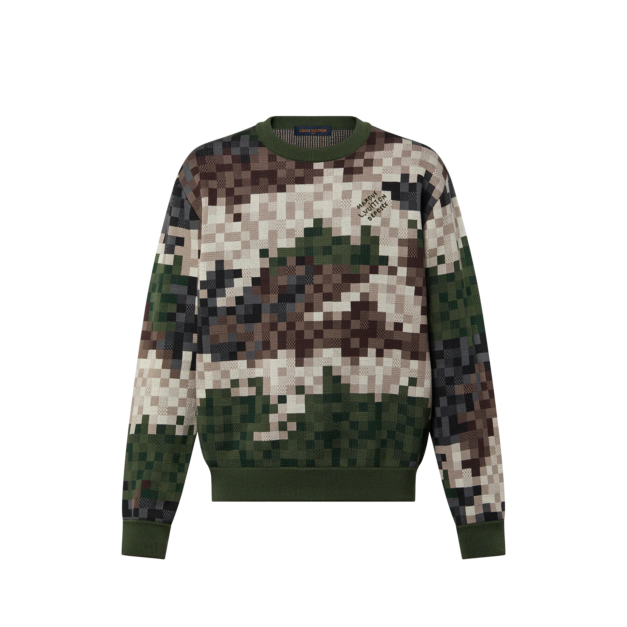 This intricately crafted pullover features the SS24 Show’s Damoflage motif in a complex cotton jacquard that reinterprets the iconic Damier in camouflage colors. This piece is further embellished with the LV Lovers slogan, introduced by Pharrell Williams, which is picked out with studs and embroidery across the back, bringing a distinguished touch to casual looks. - Regular Fit - Allover Damoflage in an eight-color jacquard - ‘Marque L. Vuitton deposee’ embroidered on chest - Studded LV Lovers signature on back with embroidered flower - Ribbed collar, cuffs and bottom hem - Multicolor - 100% Cotton - Made in Italy