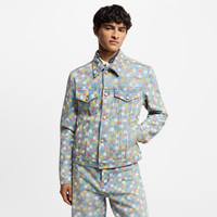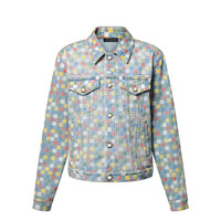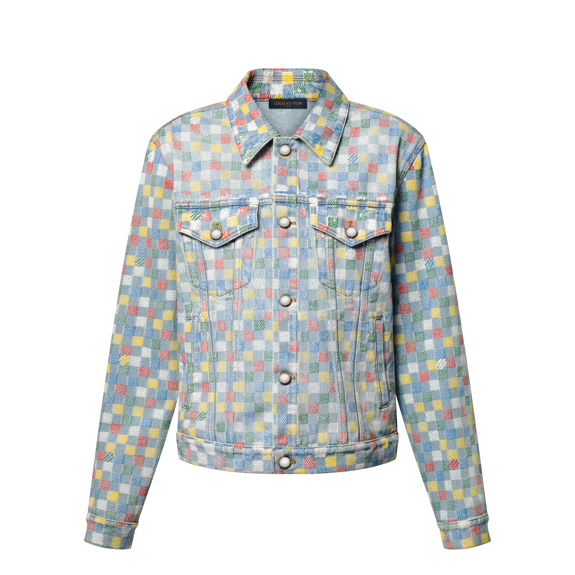 This graphic trucker jacket in washed, organic denim is adorned with the emblematic LV Vers Damier motif incorporating Marque L.Vuitton Deposee signatures from the Spring-Summer 2025 show. Printed in bold primary colors with a hand-painted effect, it recalls the display of flags at the UNESCO rooftop garden where the collection was presented. Pearl-effect buttons lend a sophisticated finishing touch. - Regular fit - Multicolor - 100% Cotton - Adjustable waist tabs - Pearl-effect buttons in old gold setting - 2 chest pockets - 2 side pockets - Adjustable waist - Printed signature motif - Made in Italy