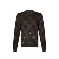 Crafted in a lustrous silk-cotton blend, this long-sleeved crewneck is a laid-back yet sophisticated piece for evenings. Drawing on the Fall-Winter 2025 show’s cherry blossom theme, it features a chunky-knit tonal allover Damier motif, which is embroidered with jewel-like rhinestone flowers in a gradient effect. An ornamental Pearl LV Cherry Blossom signature is embroidered above the bottom left hem. - Regular fit - Chocolate Brown - 62% Silk, 38% Cotton - Knitted signature motif all over - Embroidered rhinestone signatures on torso and sleeves - Ribbed cuffs, collar and hem - Signature embroidery above bottom left hem - Made in Italy