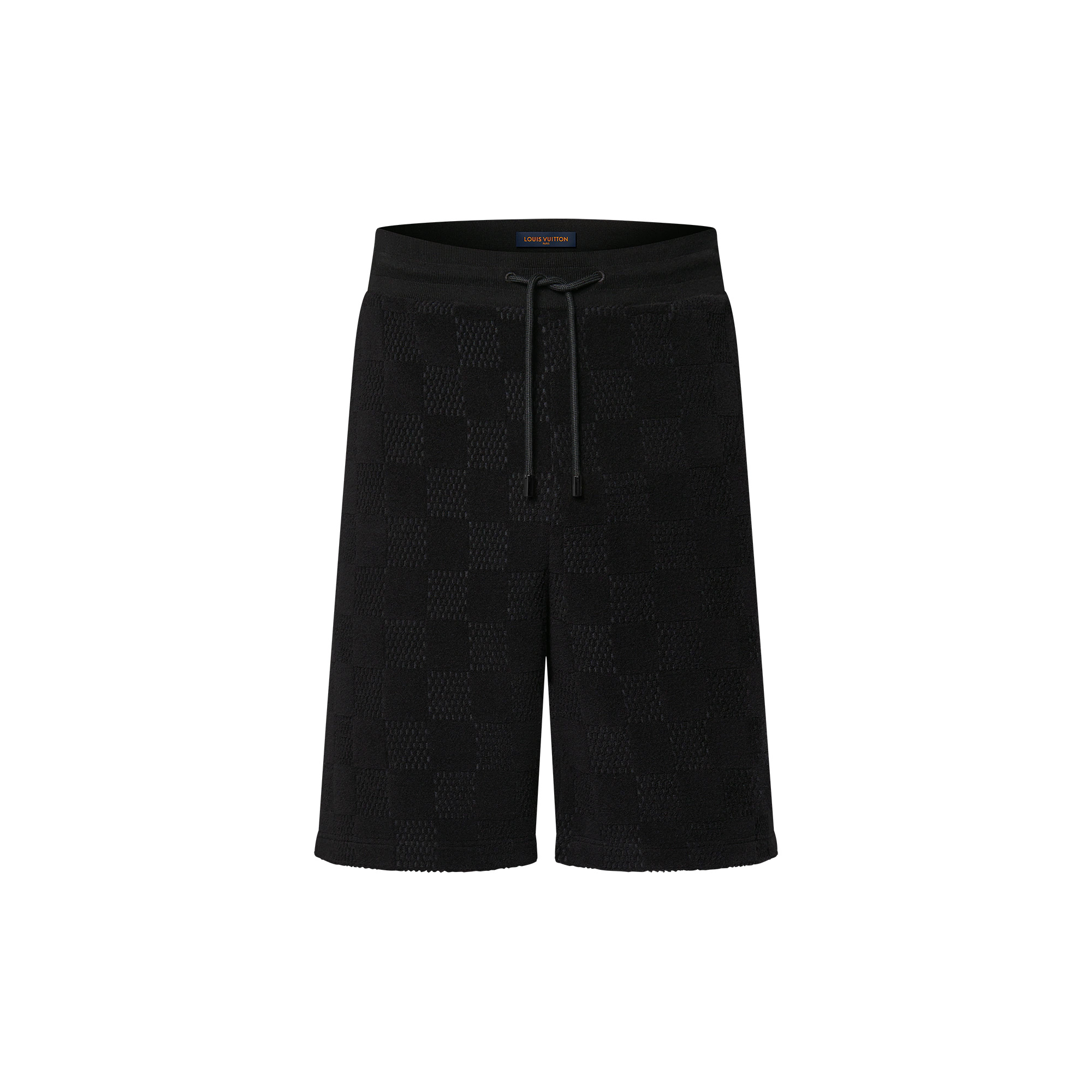 These black cotton drawstring shorts are crafted from soft French terry with a textured allover Damier and an embroidered ‘Marque L.Vuitton deposee’ signature on the left leg. Perfect for relaxing by the pool, this piece has a matching t-shirt for an effortless summer set. - Regular Fit - Damier French Terry - ‘Marque L.Vuitton deposee’ embroidery on left leg - Ribbed drawstring waist - Cordon stoppers with engraved LVs - Two side pockets - One patch pocket at the back - Meteorite - 85% Cotton, 15% Polyamide - Made in Italy