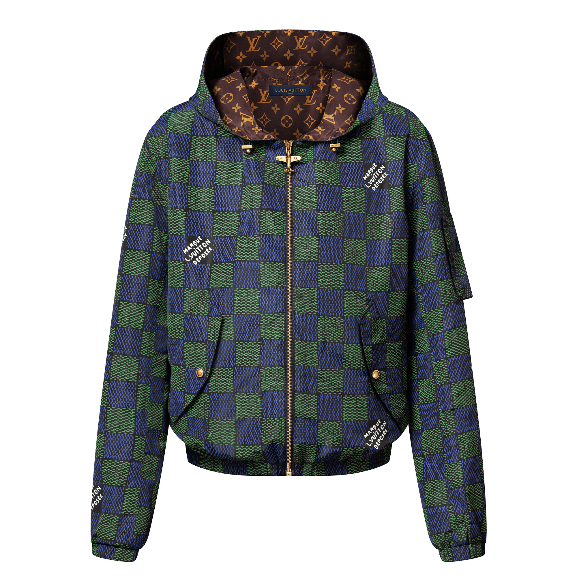 This graphic reversible windbreaker from the Spring-Summer 2025 show features a modern take on the Damier in vibrant blue and green tones on one side, and an allover Monogram in the House’s heritage brown colorway on the other. Lightweight and easy to pack, it is playfully adorned with a gold-toned metal airplane zipper puller engraved with House signatures. - Regular fit - Multicolor - 100% Recycled Polyester - Reversible with different House signatures on each side - Zipper fastening with airplane puller - 1 zipped bomber pocket on the left sleeve - 2 flap pockets on Damier side - 2 piped pockets on Monogram Side - Hood with elasticated drawstring - Elasticated waist and cuffs - Made in Italy